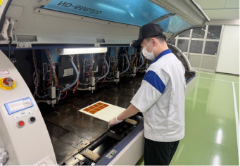 現在は、樹脂でつくってきた基板をガラス素材へ置き換える新技術に挑戦しています。ガラスの特性を活かすためのプロセスをゼロから設計し、試作・評価を繰り返しながら、実用化に向けた基板を整備。